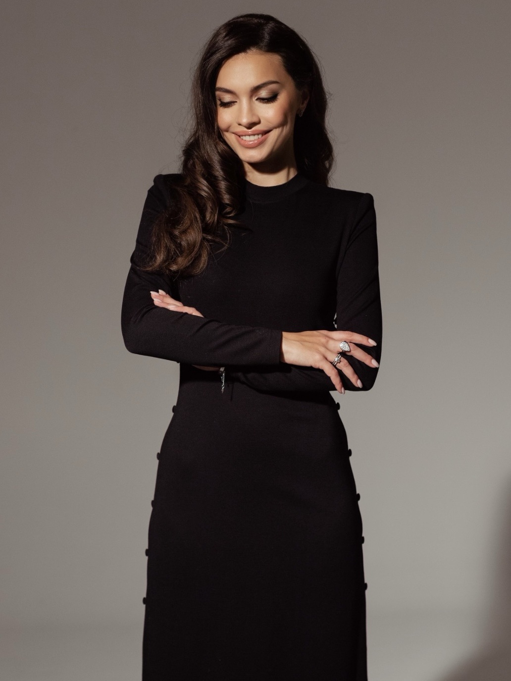 Платье 'Jacqueline' выполнено из плотного трикотажа с вырезами по бокам в длине мини. Платье отделано пуговицами, вставлены фактурные плечики для придания более изящного силуэта.