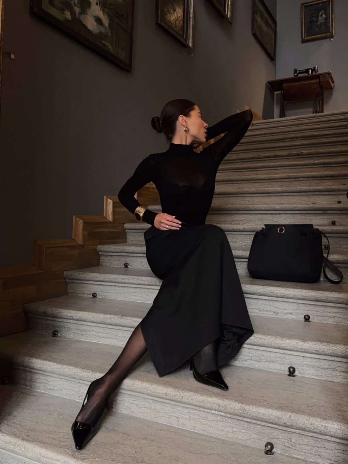 Прямая макси-юбка классического кроя, выполненная из плотной ткани, идеально подчеркивает силуэт и придает образу элегантность.